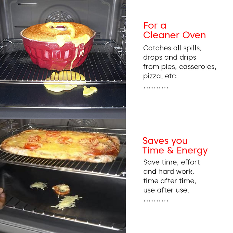 - DURABILITY: Our 100% BPA & PFOA free Black Non-Stick oven protector keeps the bottom of your oven clean when placed on an oven rack below whatever you're baking! Our oven guard protects your oven from spills, drops, and drips from pies, casseroles, pizza, and more before they burn and stick.