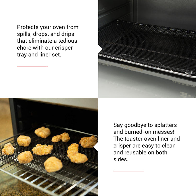 • EASY TO CLEAN: Say goodbye to splatters and burned-on messes! The toaster oven liner and crisper are easy to clean and reusable on both sides. Avoid scrubbing and wiping hard-to-reach areas with our removable oven liner and crisper tray. They are also dishwasher safe, BPA and PFOA free.