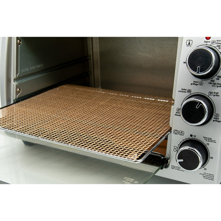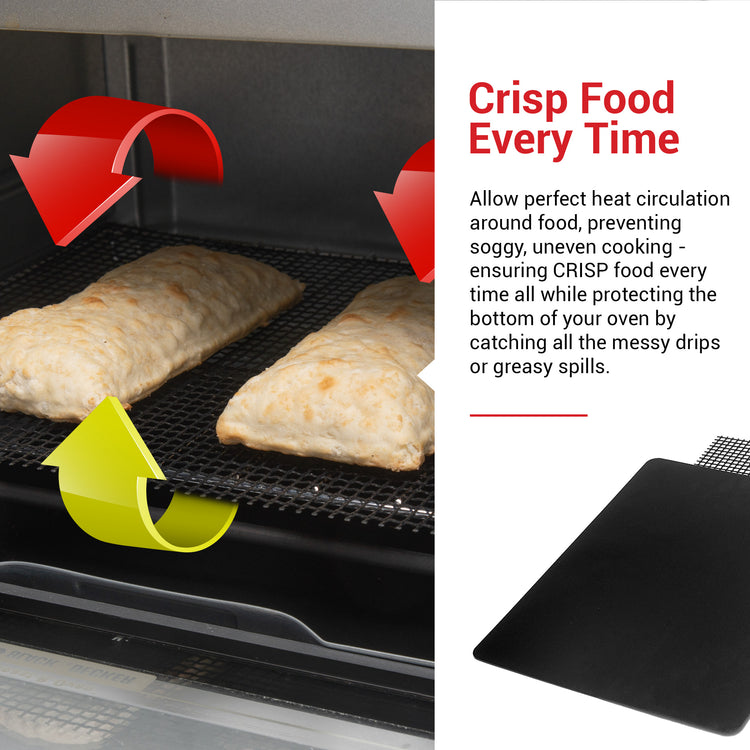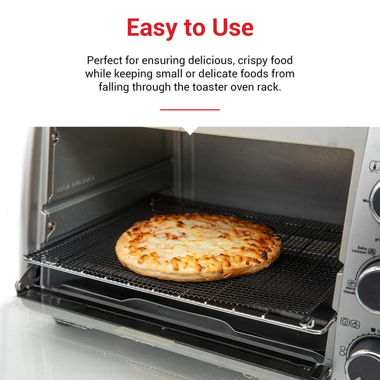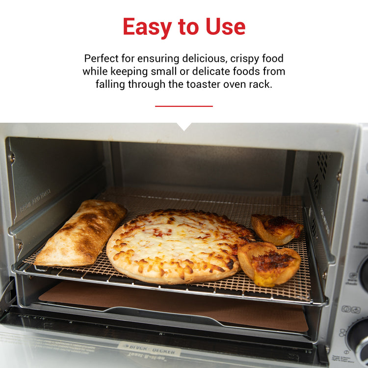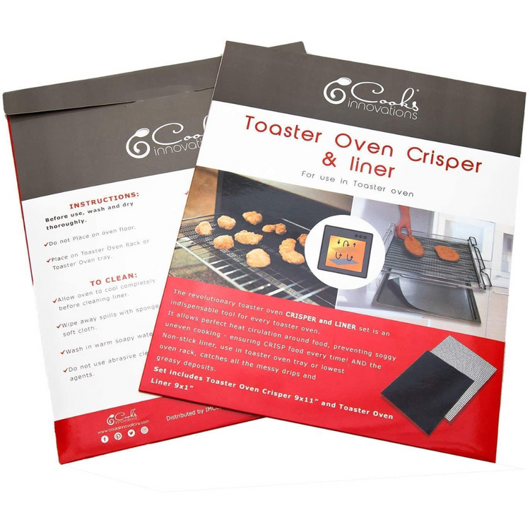 Non-stick 9" x 11" toaster oven crisper allows perfect heat circulation around food, preventing soggy, uneven cooking. Perfect to keep small or delicate foods from falling through the toaster oven rack. Ensures crisp food every time! The non-stick toaster oven liner catches all the drips so cleaning the bottom of the toaster oven is a breeze! Both are easy to clean and reusable on both sides.